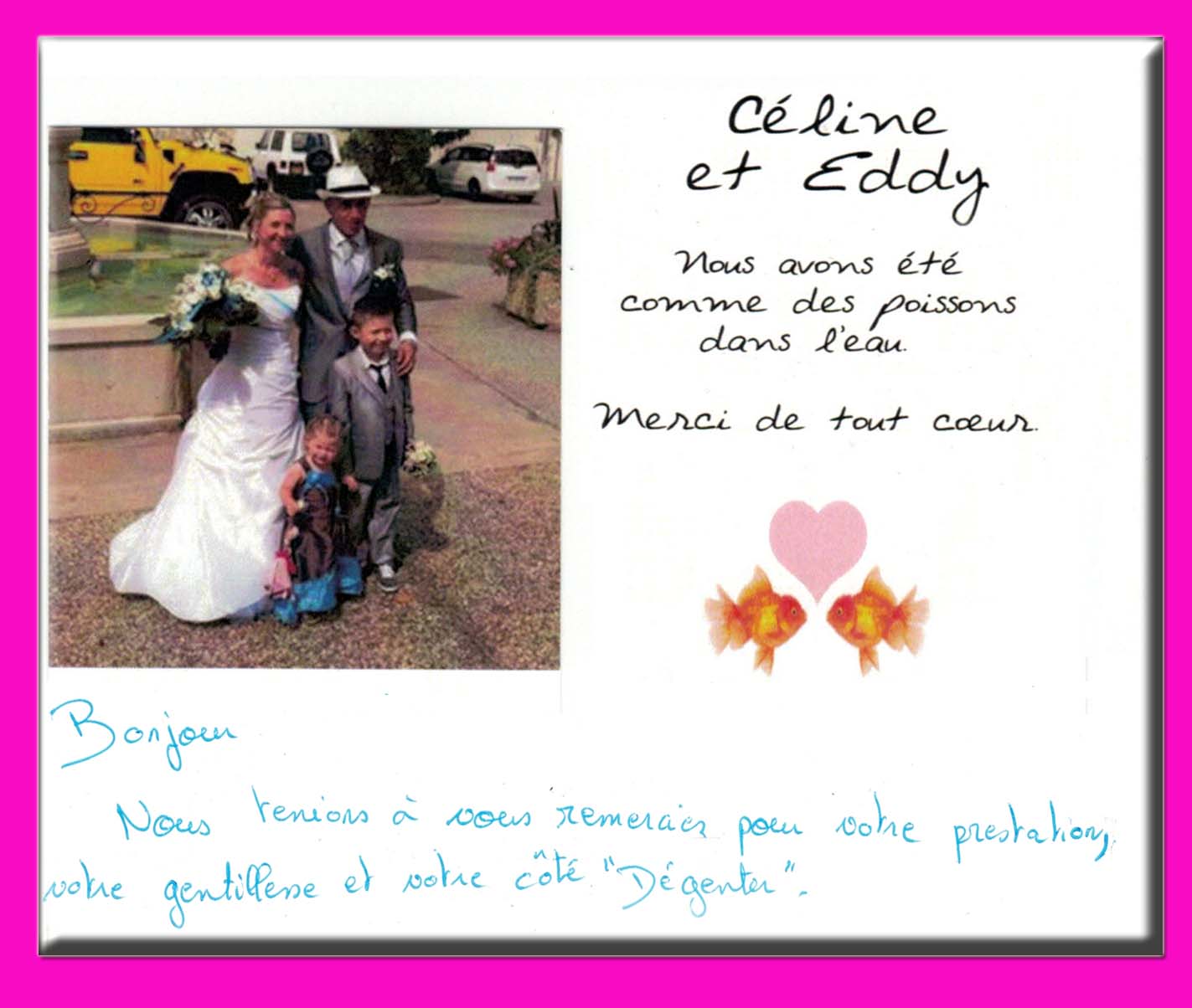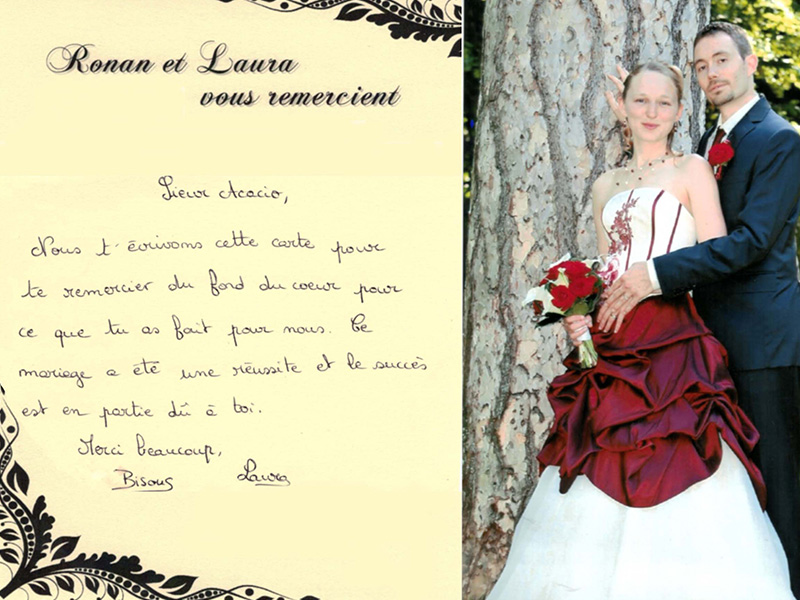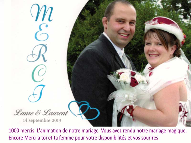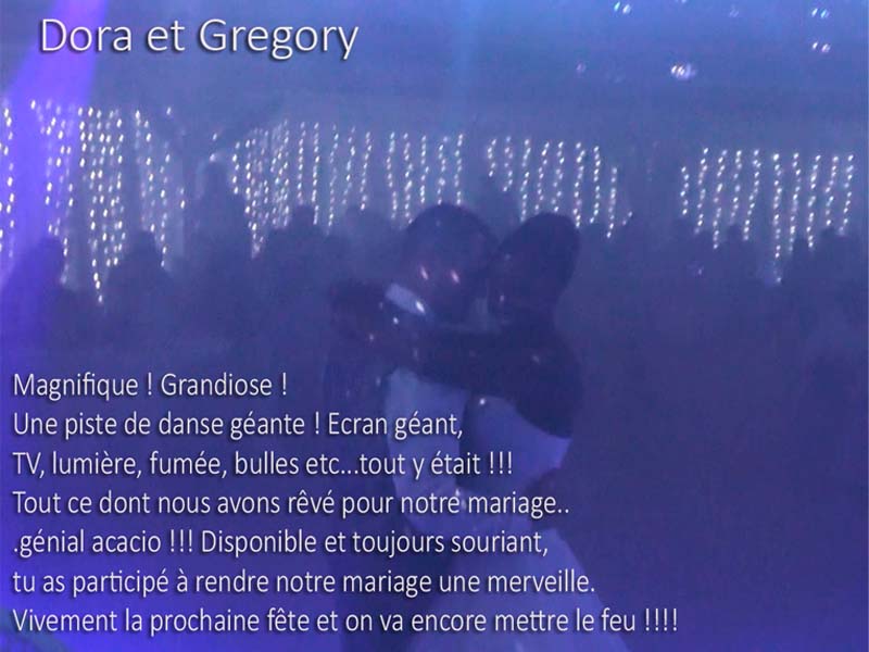 Un énorme MERCI à Acacio et Florent pour notre mariage du 27 août ! Ils nous avaient promis du grandiose et ils ne nous ont pas menti !! Une installation du tonnerre (les gens ont été épatés) et une animation de foliiie ! Merci à Acacio pour le bon son et Florent pour les lumières ! Merci d'avoir rendu la soirée de notre mariage inoubliable... Les personnes dont nous bien sûr se souviendront longtemps de cette soirée !!